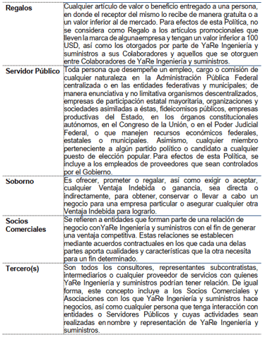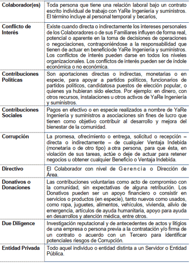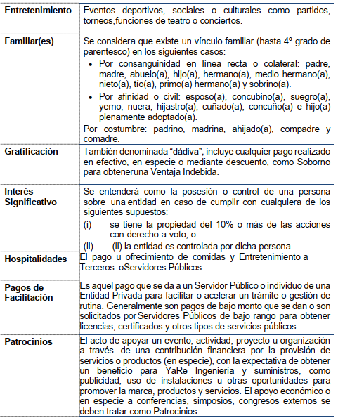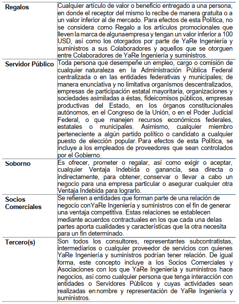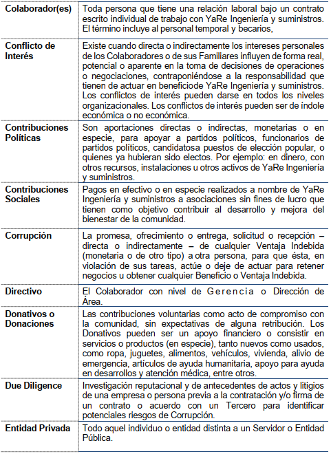 YaRe Ingeniería y suministros tiene una política de cero-tolerancia ante actos de Corrupción y Soborno de cualquier clase; por ello, está prohibido participar en este tipo de actos a los Colaboradores o Terceros que actúen para o en nombre de cualquiera de YaRe Ingeniería y suministros.