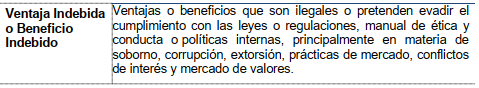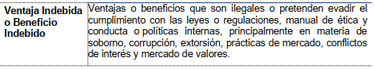 Se consideran actos de Corrupción y Soborno desde pagos en efectivo hasta cualquier objeto de valor incluyendo comisiones infladas, tratos preferenciales, Regalos, rebajas y descuentos, Hospitalidades en exceso a los límites establecidos, contribuciones o Donaciones, cuando son otorgados a un Servidor Público o Entidad Privada, o a miembros de su familia a cambio de un beneficio tangible o intangible.
