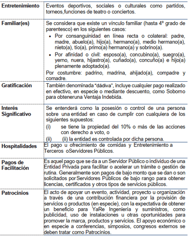 Los Colaboradores tienen prohibido dar o prometer Gratificaciones directa o indirectamente a Servidores Públicos, Entidades Privadas, algún Familiar de los mismos o entidades en las que tengan un Interés Significativo o personas físicas, con la intención de inducirlo a usar su posición, poder o influencia para ayudar a YaRe Ingeniería y suministros a obtener una Ventaja Indebida. De igual forma, los Colaboradores no deben por ningún motivo solicitar, requerir, aceptar, ni recibir, alguna Gratificación para ellos o algún Familiar por parte de un Servidor Público, Entidad Privada, algún Familiar de los mismos o entidades en las que tengan un Interés Significativo o personas físicas, que pueda dar como resultado una Ventaja Indebida aparente o real para YaRe Ingeniería o para el propio Colaborador.